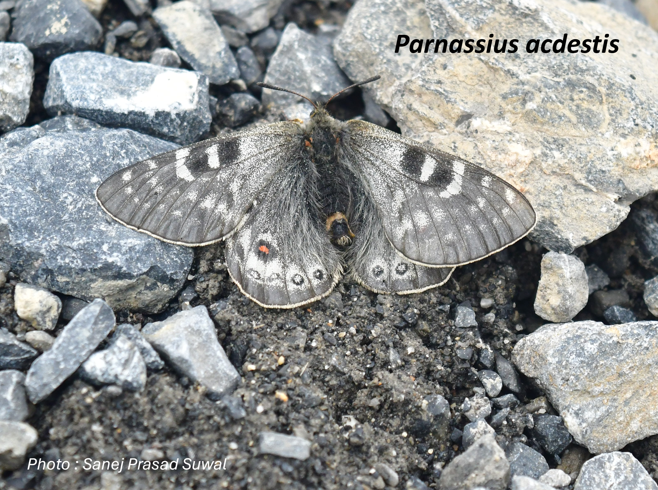 One notable rare species of Parnassius found in Nepal is the Sikkim Banded Apollo (Parnassius acdestis), which is confined to limited areas of the western Nepal within the elevations of 4,698 m to 5,245 m. Its three endemic subspecies (markii, laurentii and whitei) were documented by Epstein (1979) from Manang and Dolpo of west Nepal.